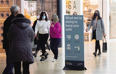 3月2日,人们走过加拿大多伦多一处购物中心里的防疫广告牌。