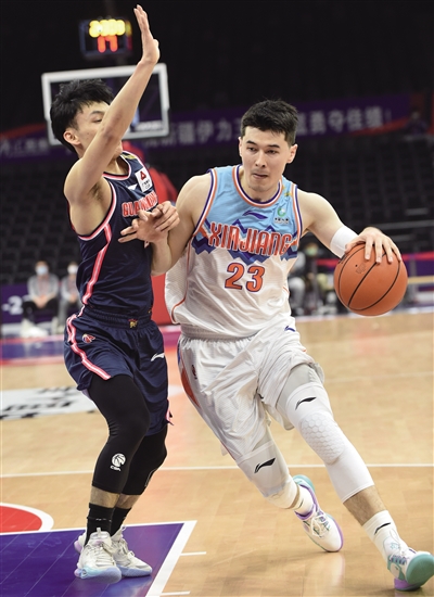 3月3日,在广东佛山进行的2021-2022赛季中国男子篮球职业联赛(CBA)第三阶段第30轮比赛中,新疆伊力王酒队以109∶107战胜广东东莞大益队。图为新疆伊力王酒队球员阿不都沙拉木(右)在比赛中带球突破。