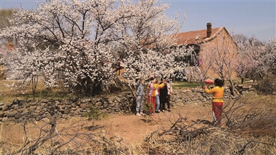市民在杏花下合影(资料图) 本报记者 戎禹仁 摄