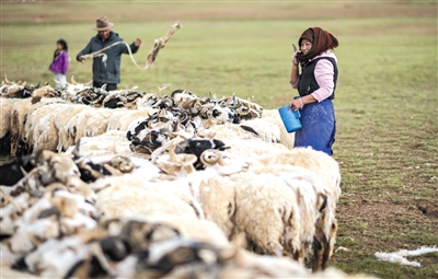 7月12日,在西藏那曲市双湖县多玛乡,牧民准备挤绵羊奶。