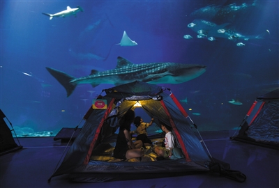 8月27日,体验者在珠海长隆海洋王国鲸鲨馆搭帐篷夜宿,在鲸鲨保育专家的科普中增长知识,近距离体验与鲸鲨等海洋生物同眠的奇妙之夜,感受人与自然和谐相处,传递生态保护理念。