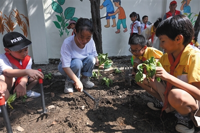 ▶8月29日,龙泉小学老师带领学生在校园里的“方圆农场”学习种菜。