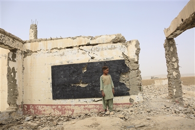 8月23日,在阿富汗南部赫尔曼德省桑金地区,一名男孩站在废墟之中。
