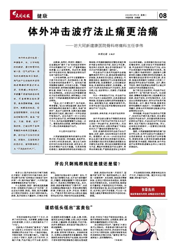 李伟提醒,冲击波疗法虽然治疗范围广,但任何治疗都不是万能的,而且看似容易的冲击波治疗,其实蕴含深奥的软组织损伤治疗理论,不适当的治疗不但功倍事半,而且可能对人体造成伤害。所以,在有相应的病患时,一定要到正规的医院,遵医嘱治疗。