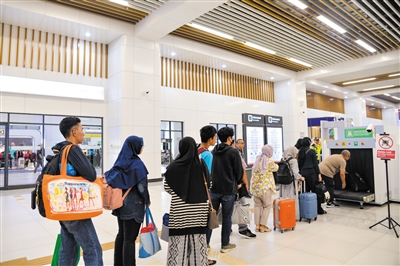 ◀ 3月3日,在印度尼西亚雅加达哈利姆站,乘客排队接受安检准备进入候车大厅。