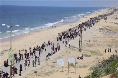 ◀ 这是4月14日在加沙地带中部拍摄的向北返家的人群。
