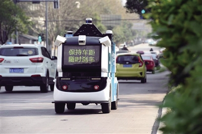 ▲ 2022年3月15日,一辆无人配送车在合肥高新区进行公开道路测试。(资料图) 新华社发