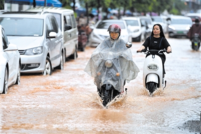 ▲ 5月8日,广西南宁遭受强降雨,市民在街头骑行。 新华社发