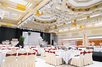 瑞丰楼最引人注目之处是位于负二层瑞丰厅的十二生肖兽首喷泉。瑞丰厅是瑞丰楼的宴会厅,厅前的十二生肖象征时间轮回,喷泉活水演绎北魏平城“天象地理”的宇宙观,以呼应瑞丰楼中庭的穹顶壁画,构建天地人共鸣的沉浸场域。瑞丰楼宴会厅以灵活的空间布局和专业设备为主要特征,可承办婚宴、寿宴、企业年会、产品发布会等多元活动。宴会厅采用无柱式设计,配备有北魏漆器纹样屏风,环境清幽。可移动隔断使宴会厅支持中式圆桌、西式长桌、剧院式等多种桌型摆设,可同时容纳四五百人就餐。智能化、专业化的灯光音响系统,可以满足婚礼、庆典等场景的个性化需求;瑞丰楼的多功能会议室配备有高清投影仪、无线投屏、智能中控系统及高速网络,支持远程视频会议与多媒体展示,以智能化设施与高效服务助力商务活动;瑞丰楼不仅为住宿客人提供丰富的中西式自助餐,还配套有健身房,为旅居的客人提供休闲健身场所。除此之外,负三层为停车场,有150个停车位,为前来就餐和住宿的客人解决停车困扰。