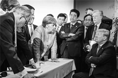 德国政府发言人上传至“推特”的一张照片捕捉到这样一幕:特朗普双手交叉抱胸坐着,其他6国领导人站立着围在他身边。