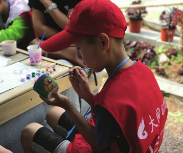 小记者分成两组,在准备好的小花盆前,拿起准备的颜料和笔,开始工作了,小草、小动物、小花等各有展现,五彩缤纷,着实好看。