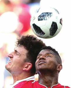 ◀24日,英格兰队球员马奎尔(左)与巴拿马队球员埃斯科瓦尔拼抢。 新华社发