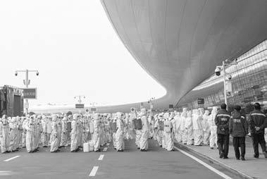 4月3日,消防队员准备进入武汉天河国际机场T3航站楼进行消杀作业。