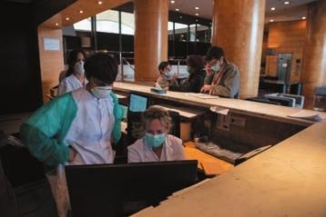 4月6日,医务人员在西班牙巴塞罗那的巴塞罗那广场加泰罗尼亚酒店内工作。