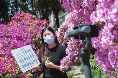 4月13日,武汉植物园的工作人员在一片杜鹃花海中直播讲解科普知识。