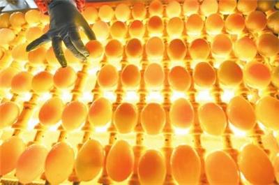 江苏高邮鸭集团的工作人员在生产线上对鸭蛋进行光检作业(4月15日摄)。