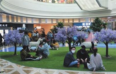 购物中心作为目前人们社交与休闲的载体,承载着大众对于美好生活的向往,其视觉传达、品牌组合、便利体验都彰显着以人为本的理念,特别是在当下,对生命健康的赋能成为各购物中经营的重点。作为国家级绿色商场的星茂汇VOVO PARK,更是将对生命与健康的关怀放在了重中之重的位置,其中厅场景的设计和布置正是本着这样的原则。置身其中,不光是让人眼前一亮,绿色的草坪、生动的动物,还有点缀其间的帐篷、丁香花、树墩等一系列高仿真造景素材,将野外露营所有的场景在这里还原,吸引了大量顾客进行互动。而整个商场也以绿色为主题进行布置,让人满眼都是春天的生机勃勃。人们或卧或坐,享受着绿色带来的舒适和惬意……