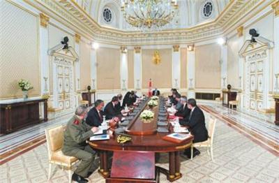 4月17日,突尼斯总统赛义德(中)及国家安全委员会成员在位于首都突尼斯市的总统府举行会议。