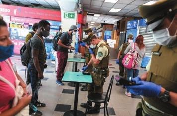 4月20日,乘客在智利圣地亚哥一个长途车站接受警察检查后方可乘车。