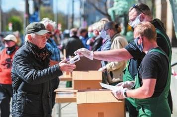 4月20日,在德国萨克森州首府德累斯顿的市政厅前,工作人员向一名男子发放口罩。