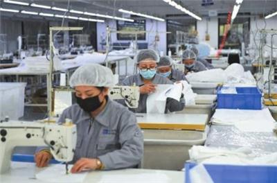 4月24日,在北京邦维公司生产车间内,工人缝制可重复使用医用防护服。