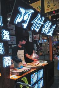 记者跟随熙熙攘攘的人流,走进了凤凰老街小吃城。一进门,浓浓的怀旧风格让人眼前一亮。这里的小吃档口有10多家,经营的品种十分丰富,有炒年糕、炒凉粉、烤面筋、烤羊肉串、章鱼小丸子、锅盔、臭豆腐,以及冰激凌、炒酸奶、各式奶茶等,每个档口前都有不少顾客在等餐。在一家炒年糕的档口,记者看到,粘稠的亮色汤汁包裹着条状年糕,正咕嘟咕嘟冒着气泡,老板时不时地搅一下,香气随之飘散,十分诱人。记者忍不住买了一份,迫不及待地吃上一口,韧劲十足的年糕搭配脆脆的辣白菜和细腻的鱼豆腐,口感层次十分丰富。