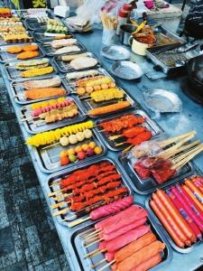记者看到,在众多摊位中,数量最多的是卖各种串的,包括冷锅串串、涮串、烤串、炸串、关东煮等。除此之外,还有铁板鱿鱼、手抓饼、烤冷面、炸鸡排、竹筒粽子、花甲粉等,散发着香味的摊位引得众多食客驻足。