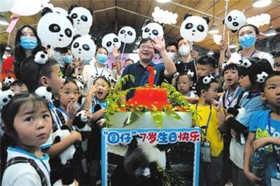当日,在都江堰青城山基地,在川台胞家庭代表等通过视频连线的方式,与在台北市立动物园的熊猫粉丝,共庆“圆仔”生日。“圆仔”是大陆赠台大熊猫“团团”“圆圆”的首个宝宝,于2013年7月6日在台北市立动物园诞生。