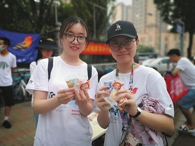 记者注意到,郑洁他们的“加油小礼物”只不过是些很平常的纸巾、湿巾、矿泉水、扇子,但他们在每一件小东西上都贴了祝福语:“金榜题名”“幸运锦鲤”“旗开得胜”“考的全会”“蒙的全对”……为高考生送上了同龄人的祝福和心理慰藉。