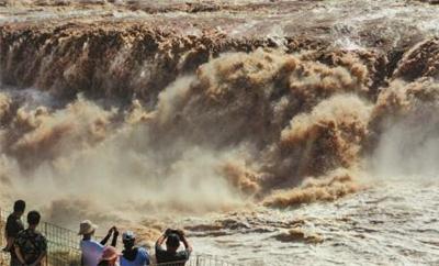 近日,位于秦晋大峡谷的黄河壶口瀑布出现难得一见的“金色瀑布”景观。