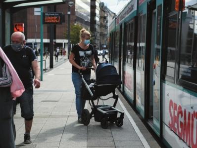 7月7日,在德国法兰克福,一名戴口罩的女子准备搭乘电车。