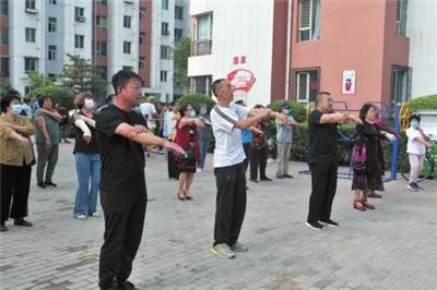 图为居民在区武术协会工作人员引领下学做强身健体操。