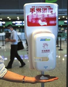 7月10日,一名旅客在虹桥机场候机大厅使用消毒洗手液。