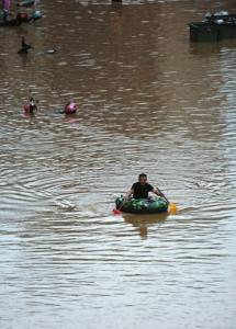 7月11日,在融水县县城,一名男子划着小船出行。