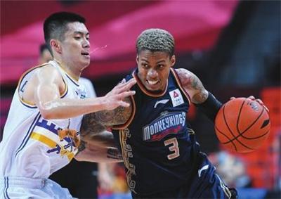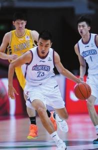 在另一场比赛中,浙江广厦控股队以125∶93战胜天津先行者队。 图为天津先行者队球员时德帅(中)在比赛中带球进攻。