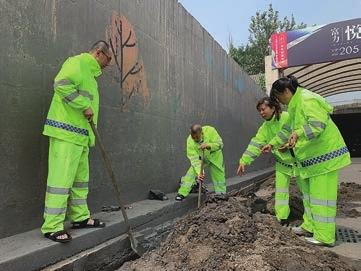 23日上午,记者在大塘路下穿南环西路看到,20余名工作人员正在清理道路两侧边沟、流向泵站的雨水管线,道路上的横截沟需要工作人员通过水箅子的缝隙将淤泥打碎,再将淤泥装筐运出。