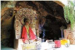 从游览台阶上下来看到的第一个洞窟就是编号为第6窟的佛殿窟,石窟的前半部分已崩塌,刻于石窟后壁的交脚弥勒大佛外露。弥勒大佛高3.5米,为万佛堂现存体量最大的造像。弥勒身披迦纱,慈眉善目,面带微笑,是典型的北魏佛造像,保存完好,底座为近年补修。