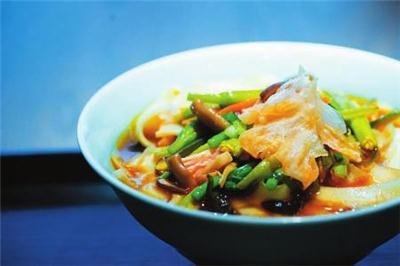 | 黄花素面厨师:张海清 配料:鲜黄花、白玉菇、腊肚菇、蟹味菇、杏鲍菇、木耳、银耳等 做法:各种主料氽水待用;锅中下油,葱、姜炒香,加入酱料、各种主料炒香,加汤、调味出锅;浇入老大同传统刀削面中即可。 口味:面条筋道,咸鲜爽口。 |