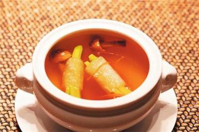 | 松茸黄花养生汤 厨师:李伟 配料:鲜黄花、松茸菌、竹笙 做法:将鲜黄花改刀、松茸菌切片、竹笙改刀后氽水,放入炖盅;高汤加热后倒入炖盅,上笼蒸制30分钟即可。 口味:汤水清澈,鲜香宜口。 |