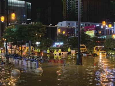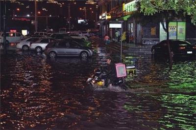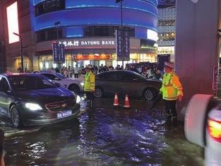 19时40分许,狂风大作、电闪雷鸣,夹杂着冰雹的降雨倾盆而下,能见度瞬间降至10米之内。正在路上行驶的汽车纷纷亮起双闪减速慢行,也有车辆慢慢停靠在路边等待着降雨停歇。20时50分许,雨势减缓。21时30分许,记者来到永泰南路,看到百盛购物中心门前的马路已是一片汪洋,积水长达200多米、深达40多厘米,行人只能蹚水而过,部分车辆被困水中。