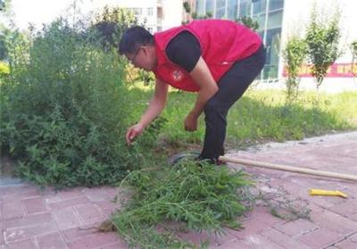 日前,平城区和泰社区党支部联合港湾物业,组织党员、志愿者开展清理杂草环境整治活动。大家分工负责,镰刀割、耙子拢,经过半天的努力,小区内的杂草、垃圾清除干净,面貌焕然一新。