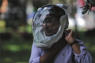 7月28日,一家创新公司工作人员在哥伦比亚波哥大的一处公园展示一款“防疫头罩”。据研发团队介绍,这一产品灵感来自宇航员头罩,符合生物安全标准,在保证使用者呼吸通畅的同时,能有效防止病毒感染。