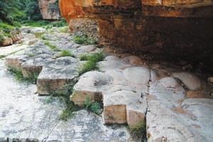 一进入黄龙峪口即是在岩石上开凿出来的水渠遗迹。不下雨的日子,水渠是干涸的,间或可见积水。沿着水渠遗迹进入沟谷,没有修整的道路,偶尔有红色油漆标注的前进方向,纯粹的原生态。