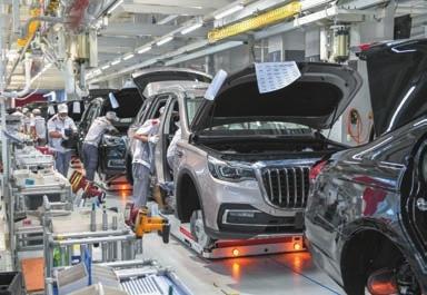 6月19日,在位于长春的一汽红旗总装车间,工人装配车辆。