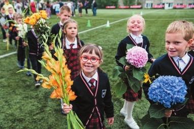9月1日,在立陶宛首都维尔纽斯,学生手持鲜花参加开学典礼。