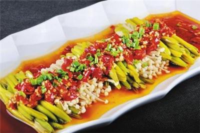 | 火山六月鲜 配料:鲜黄花、美人辣椒、鲜金针菇。 做法:鲜黄花焯水、过凉、沥干,与洗净的鲜金针菇一起摆入盘中;将美人椒剁碎,用花生油加蒜末、生抽炒成辣酱;将辣酱抹在黄花和金针菇的上面,连盘入笼蒸8分钟后取出,撒上小葱花,在盘中滴入少许生抽,炝入烧熟的热油即可。 特点:状似火山,咸鲜微辣。 营养价值:开胃下饭,去湿解暑。 |