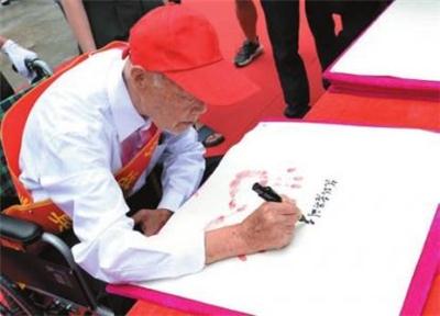 9月3日,在中国人民抗日战争胜利受降旧址,抗战老兵刘道民在手模上签字。