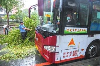 9月3日,在长春市南关区东岭南街,民警和市民搬运被大风刮倒的树木,方便公交车通过。