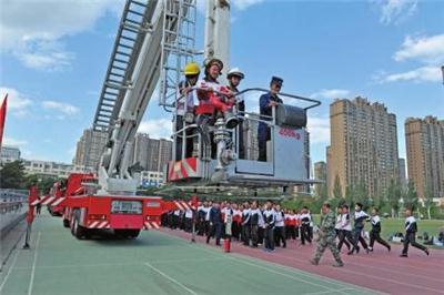 图为消防员利用云梯车模拟高空救援现场,让学生直观感受消防安全的重要性。