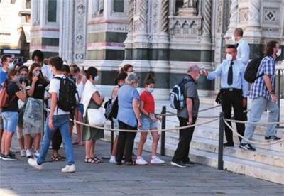 9月4日,在意大利佛罗伦萨,工作人员为排队进入圣母百花大教堂的游客测量体温。